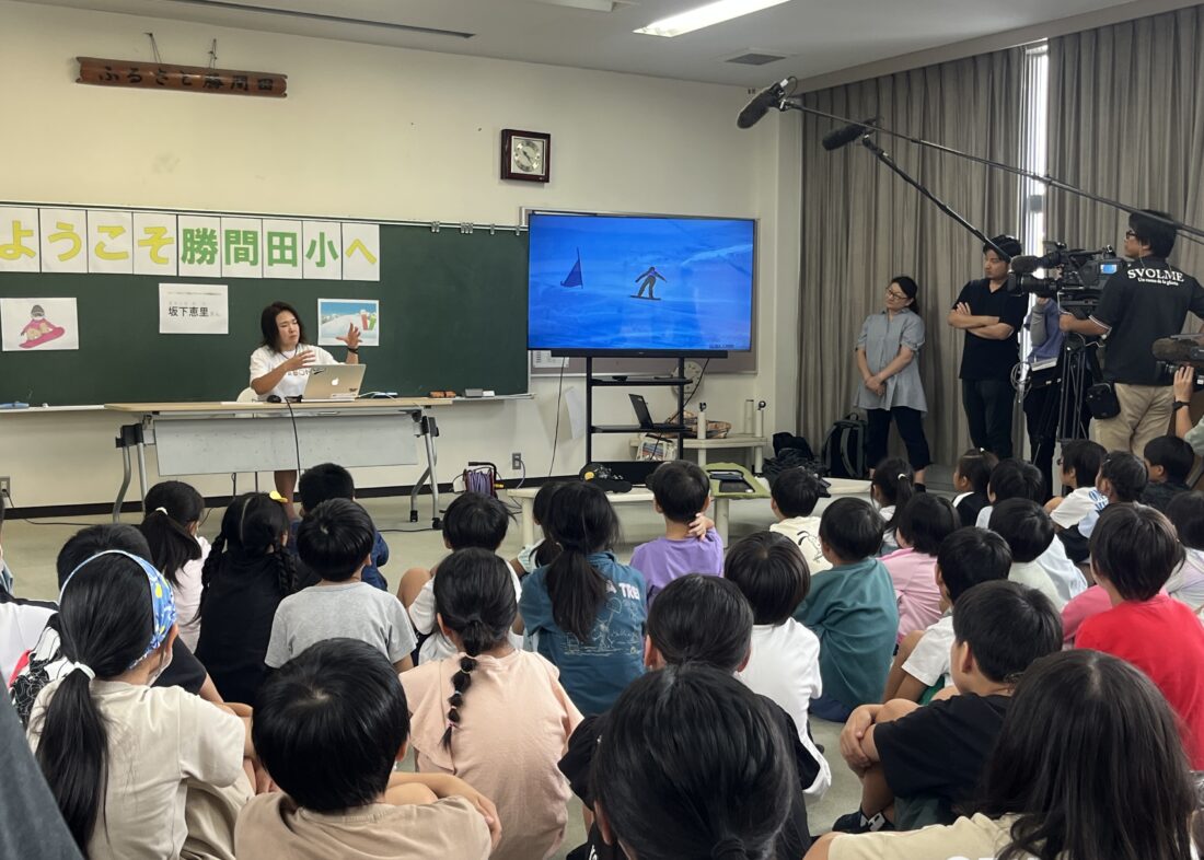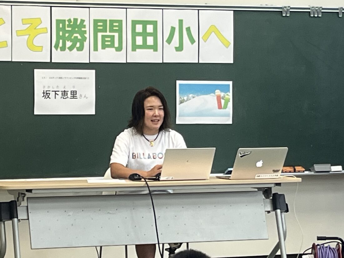 全校生徒99名を相手に、わかりやすく丁寧にこれまでの人生に起きたことやスノボードへの思いを語り、最後は勝間田小学校の校歌の大合唱、恵里さんへのエールが送られ、子ども達からの素直な質問にも気持ちがほんわか、心温まる講演会となりました。