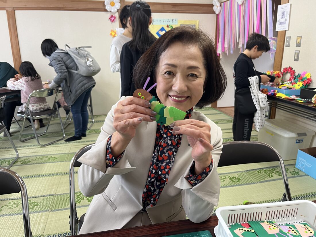 歌、折り紙、お菓子屋さん、絵手紙など、日頃の活動の披露の場。子供たちもエプロンしてお菓子屋さんのお手伝い。