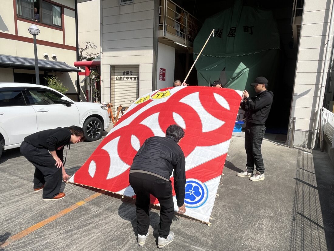 地元・板屋町の初凧が出来上がり、凧揚会メンバーにより、屋台置き場に収まりました。