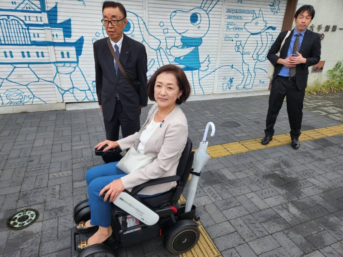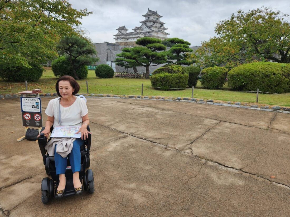 座学の後、電動車椅子【WHILL】に試乗し、修学旅行生、インバウンドで賑わう姫路城へ。10度傾斜、多少の段差を乗り越えます。これなら歩行に不安がある人も大丈夫。とても快適です。