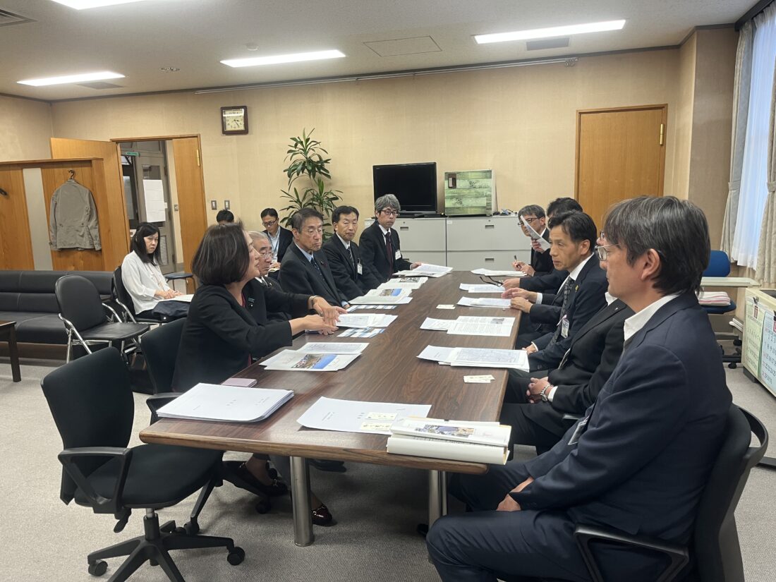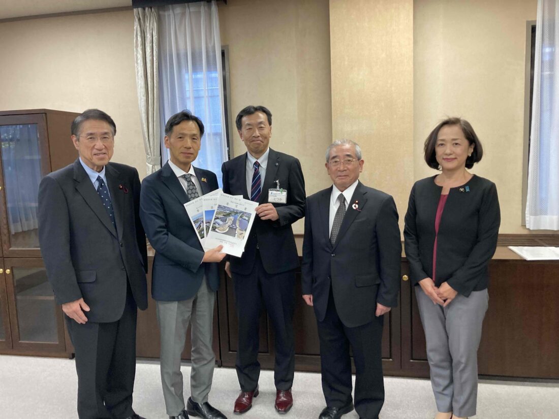 浸水を最低限に抑えるための河川整備、河川愛護活動に対する支援に関する要望に、期成同盟会の会長を務める栁川市議と高柳市議、そして戸塚技術統括監がご来庁され、高梨交通基盤部長に要望書を手渡しました。