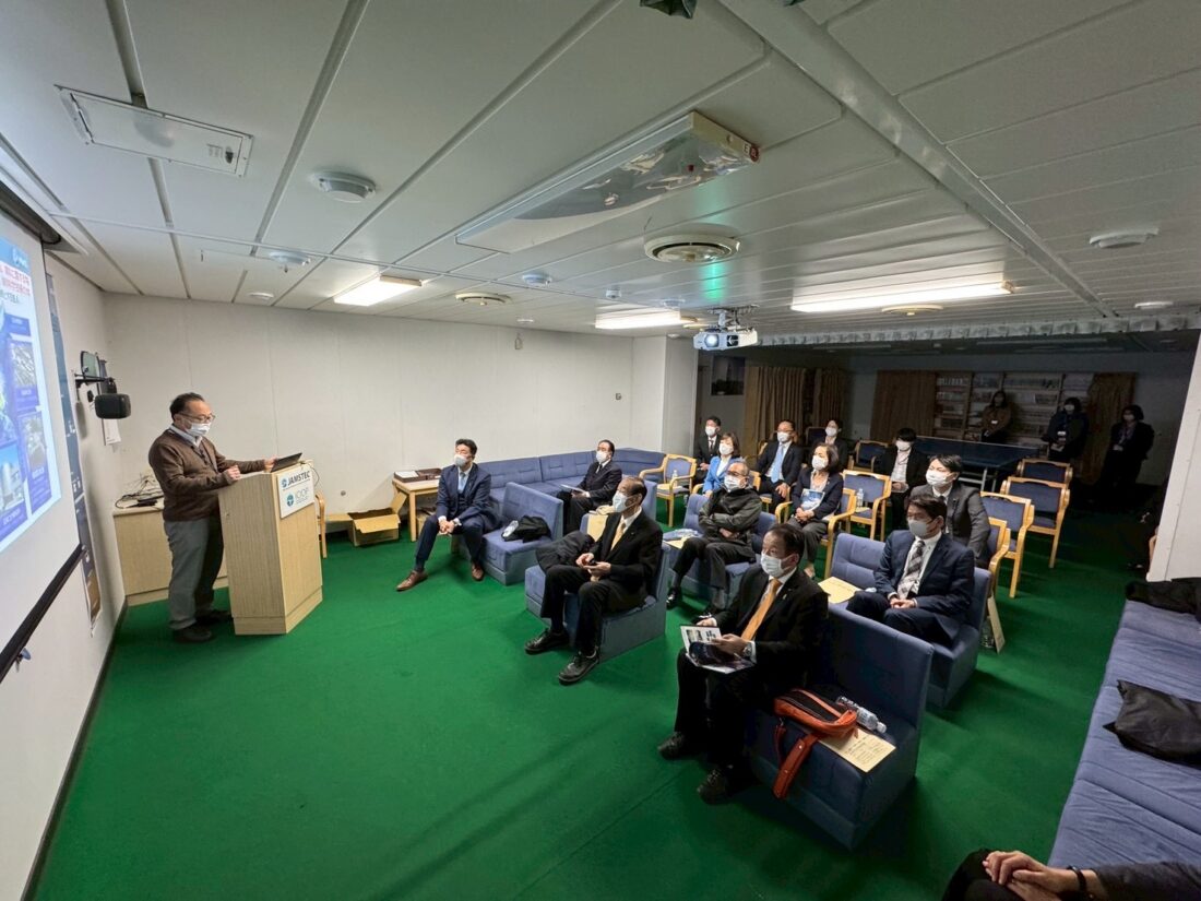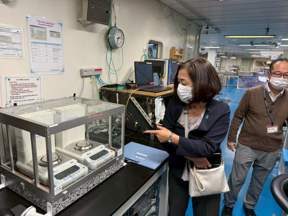 海底深部より採取した泥・石(コア)を精査する専用のCT、掘削中船を動かさない定点保持のため仕組み、世界中の研究者が集まると賑やかだというラボ、公用語はもちろん英語で長期船上生活を支える様々な工夫など、多岐に渡り説明をお聞きすることができ、唯一無二の機会となりました。