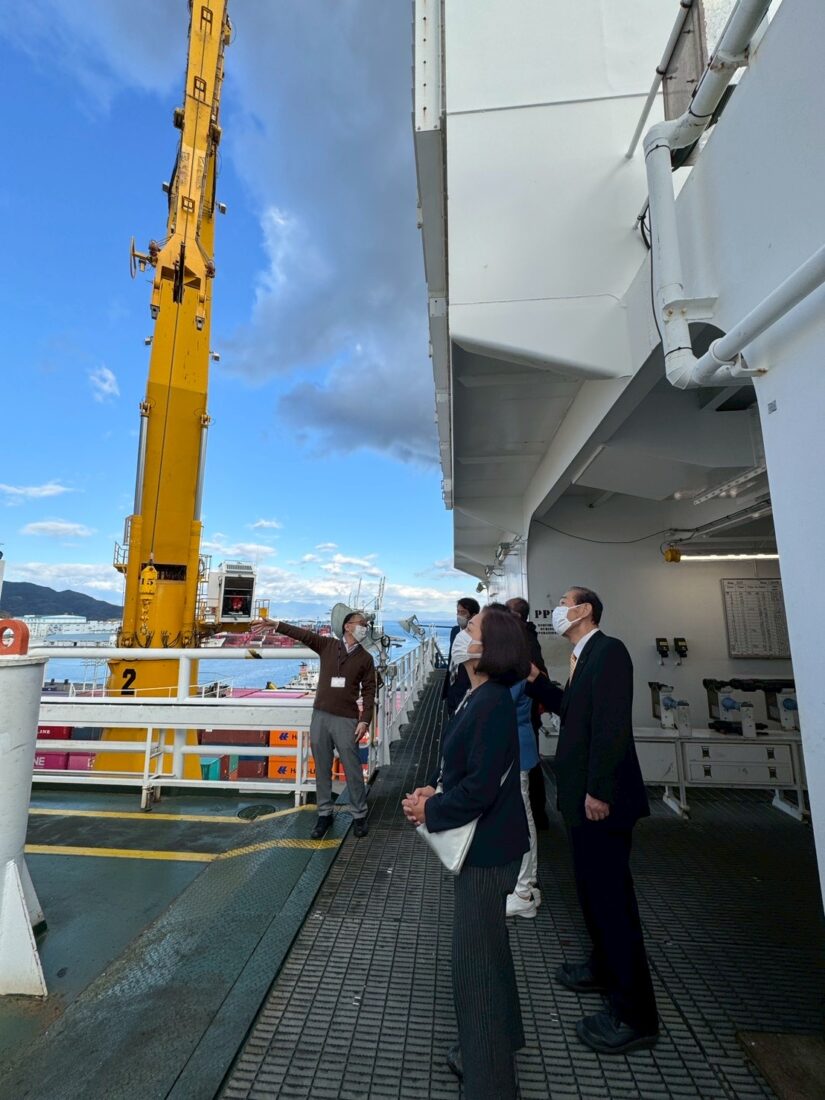 清水港に戻り前日に研究者が下山した「ちきゅう」に乗船する機会に恵まれ、船体内部を回り、掘削の仕組み、研究実態など視察しました。